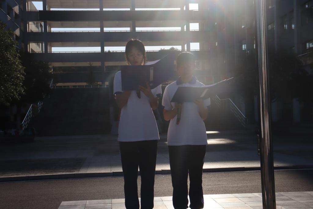 首先是来自1919班的杨玲湘和谢冰冰进行国旗下讲话。她们向全校师生发起如下倡议:热爱祖国,遵纪守法,尊师敬长,孝敬父母,诚实守信。宽容礼让,勤劳节俭,讲究卫生,从现在做起,从点点滴滴的小事做起,不断继承和发扬中华民族的传统美德,做一名讲卫生、懂礼貌、守纪律、爱学习的文明中职生,让美德善行引领社会风尚。