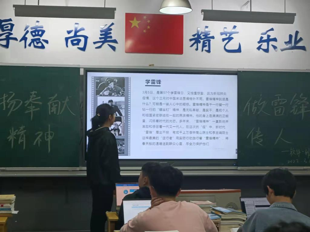 21级数媒一班主要从雷锋的奉献精神、钉子精神、艰苦奋斗精神来阐述。雷锋精神是一面旗帜,永远闪耀着盖不灭的光辉。精神是可以变成强大的民心力量的。全心全意为人民服务,“把有限的生命,投入到无限的为人民服务之中去”