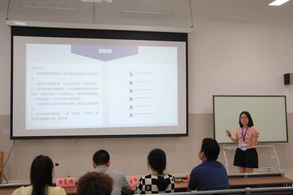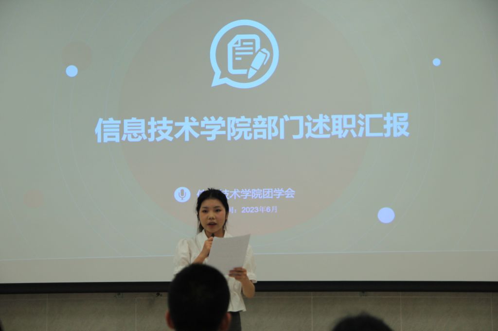 为了解学院团委学生会各部门在本学年的工作任务完成情况,进一步坚定为师生服务的工作态度,保障工作效率,提升工作质量,信息技术学院于2023年6月15日中午12点40分在德馨楼124室召开了“2022-2023学年团学会部门述职会议”。学院党总支书记李科、副院长王潇翔、副院长彭勃、陈雯婧老师以及各学生会部门成员代表参加本次会议。