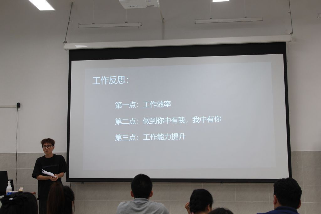 会议第二项,团学会副主席周绚同学上台发言,对各部门总体工作进行评价,全面的分析了整体工作的优缺点以及对未来工作的规划与展望。