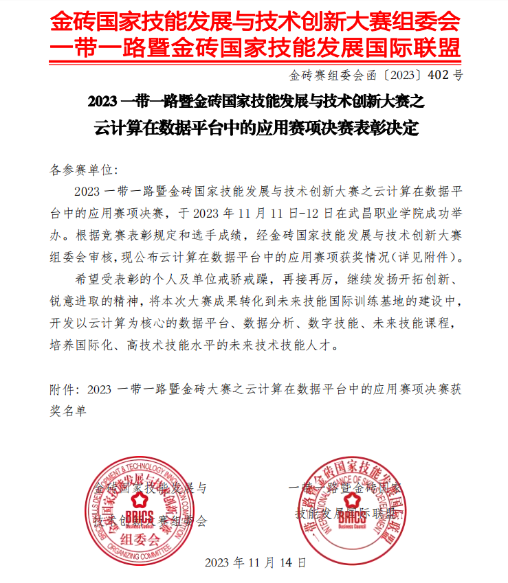 11月12日,一带一路暨金砖国家技能发展与技术创新大赛--云计算在数据平台中的应用赛项,于武昌职业学院赛区顺利落下帷幕。全国共有121支代表对队伍报名参与,包括深圳职业技术学院、湖南外贸职业学院、长沙民政职业技术学院等。经过多轮激烈比拼,最终,我院学生史章慧荣获高校组一等奖、指导老师吴佳蒂荣获优秀指导教师和最佳组织奖;学生汪呈霖荣获高校组二等奖,指导老师周海燕荣获优秀指导教师和优秀组织奖。