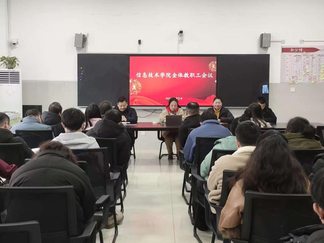 2月21日下午,信息技术学院在技馨楼103教室召开2025年春季学期全体教职工大会。会议由副院长彭勃主持,紧扣“聚力谋新篇,实干启新程”主题,强调全面落实2025年湖南省教育工作会议精神,精准对接教育部《职业教育专业教学标准-2025年修(制)订》政策要求。