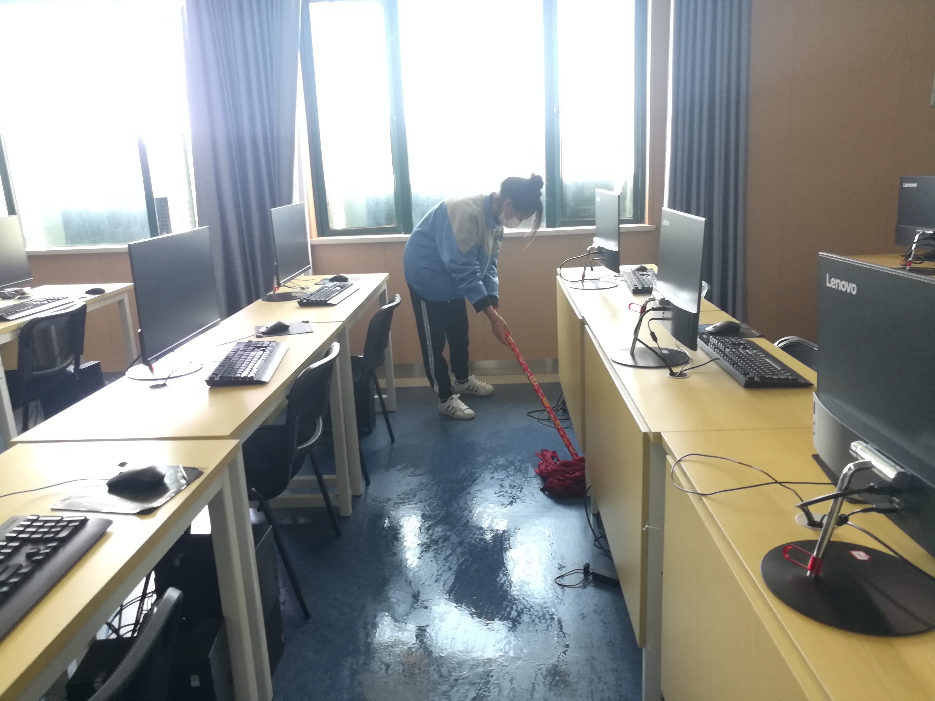 “十年树木,百年树人,立人先立德”,对于学生们最好的德行教育方法就是老师的言传身教。系部学生会八名干部和干事在陈雯婧和吴锐两位老师的带领下,于4.26日上午9:30在技馨楼大厅集合,学生会主席蒋春林同学根据参加活动的人数以及需要清理的场地范围进行了分工,清扫过程中,同学们行动迅速、分工合作,有条不紊地对实训场地310、312、206以及六间云机房等进行了清扫,经过“哈利波特们”两个小时的辛勤劳动,我们的实训场地面貌焕然一新。同学们在劳动和服务中也展现了长幼学子的风貌。
