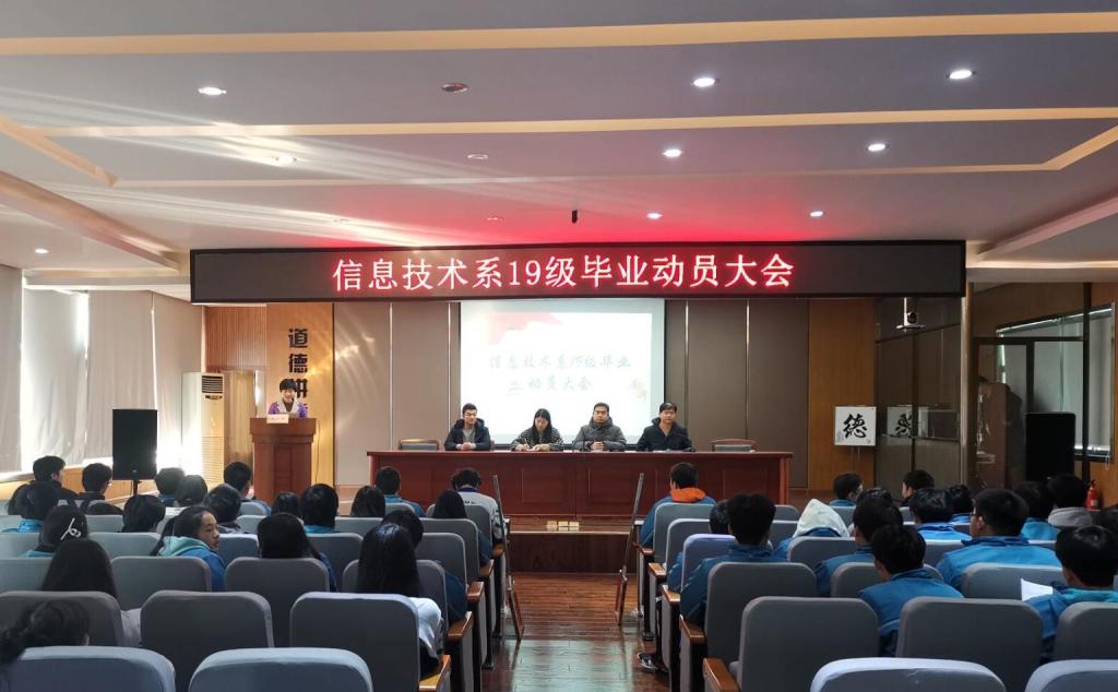 为了做好毕业生就业工作,指导学生更好地进行就业的相关准备工作,12月22日下午,信息技术系19级毕业生动员大会在东校区六楼报告厅召开。安全保卫处处长王锐、学工处副处长彭亮、信息技术系主任吴佳蒂、副主任王潇翔、各专业负责人及毕业班班主任等参加。会议由系副主任朱萍主持。