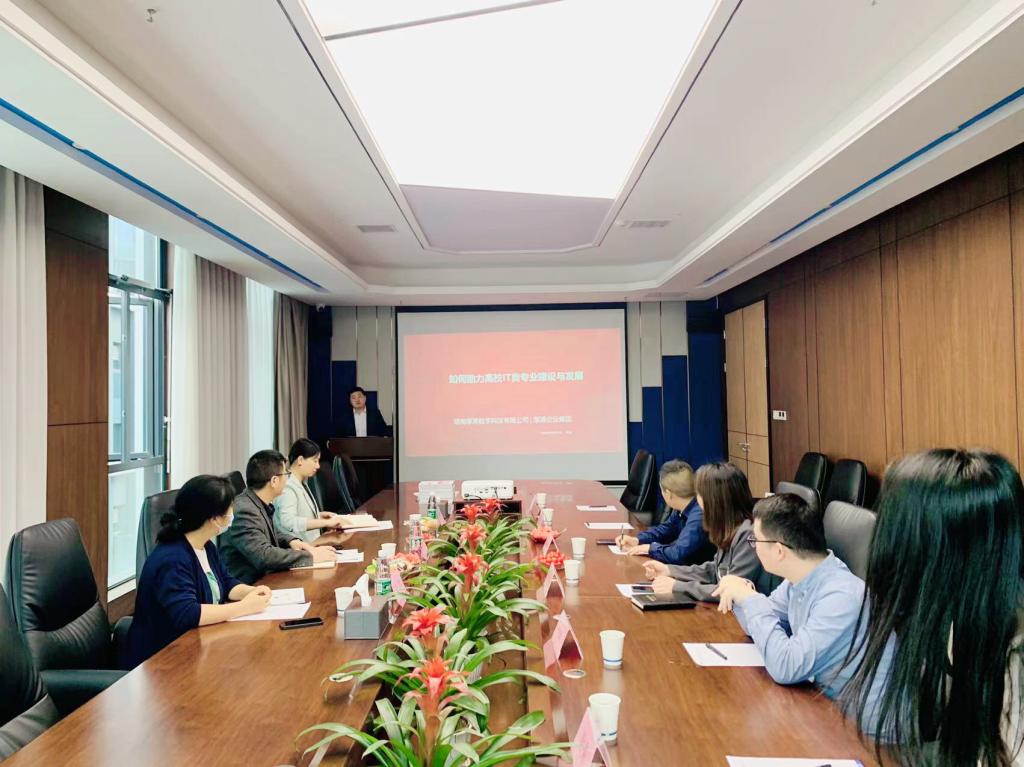 会上,黎明杰首先代表公司对我校调研人员的到来表示欢迎,并介绍公司定位、校企合作办学新模式以及目前校企合作情况。接下来,周文华副校长也对公司的热情接待表示感谢,同时也表达了此行希望能与厚溥达成合作意向的目的,实现“实训四化”即实训场景企业化、实训内容体系化、实训过程项目化、实训就业一体化。以就业为导向帮助学生顺利走进社会,适应工作岗位和职业发展要求。紧接着我校三位代表从国家政策、职业教育定位、实训项目、共享共建、双向互通、共研共育、人才培养、师资力量、创业及就业等多个方面与企方进行了深度交流和探讨,并与企业达成了初步共识。