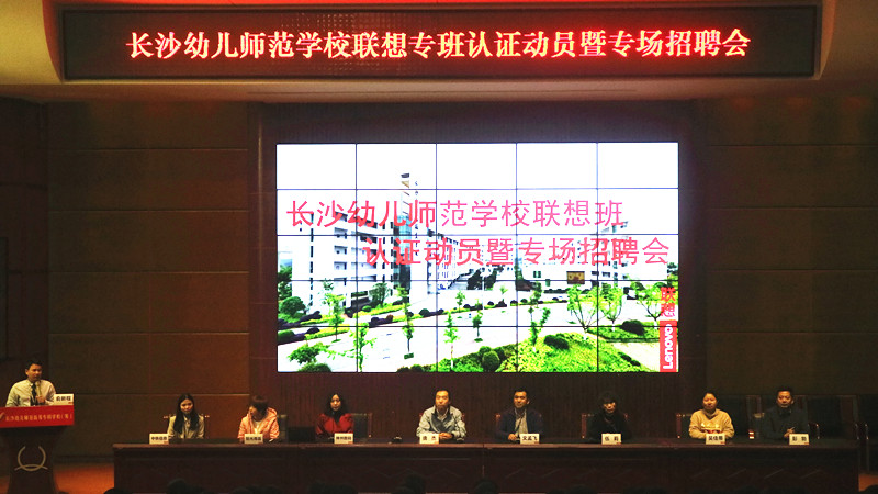 金秋时节,硕果累累。11月20日长沙幼儿师范学校联想专班认证动员暨专场招聘会于汇智厅举行,联想教育集团华南地区总经理唐杰、联想教育高级讲师俞新程以及联想集团合作企业招聘代表、长沙幼儿师范学校副校长文孟飞、招生就业科副科长伍莉、教育技术系主任吴佳蒂、联想班班主任彭勃、田伟、黄武,以及所有联想专班的同学们参加了本次招聘会。