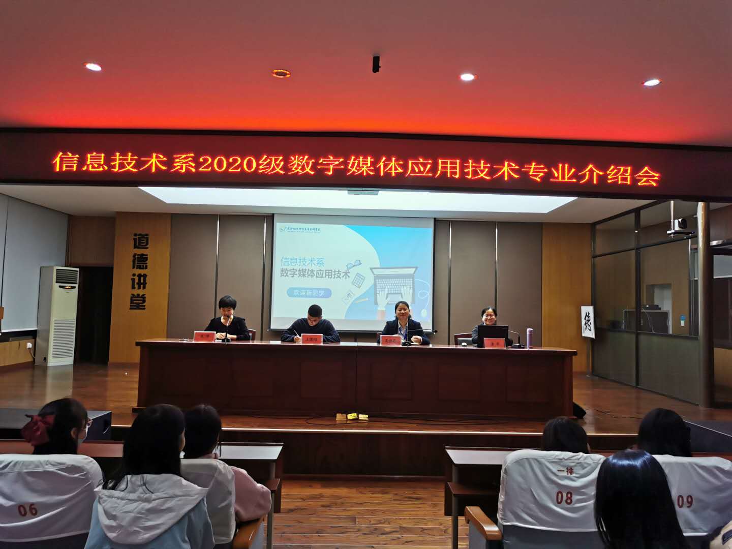 10月10日晚,信息技术系在东校区报告厅举办了2020级首届数字媒体应用技术专业大专新生专业介绍会,帮助同学们全面了解所学专业,并树立成长目标。学校副校长文孟飞、系主任吴佳蒂、副主任王潇翔、朱萍、数字媒体教研室主任唐卓、辅导员方祥、任课教师王姣宇、李柿娟参会,会议由朱萍副主任主持。