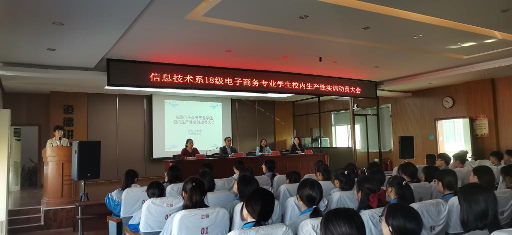 10月12日上午8:30,在学校东校区报告厅召开信息技术系18级电子商务专业学生校内生产性实训动员大会,解读实训工作实施方案,安排部署实训的相关事宜。深圳天云祥科技有限公司长沙分公司总经理李娟女士、现场主管苏霞女士、校招生就业处处长何重兴、副处长刘丹、信息技术系主任吴佳蒂、副主任朱萍,1814、1815班班主任及当堂任课教师出席会议,朱萍副主任主持会议。