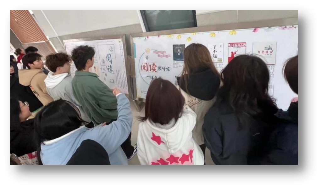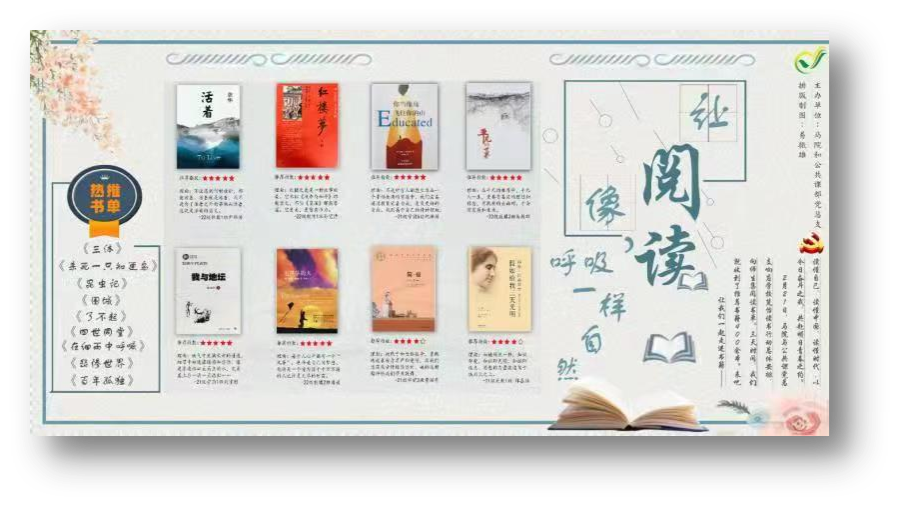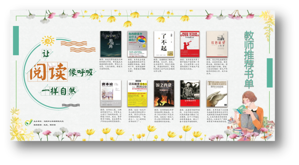马院与公共课部党总支精选师生推荐的作品,精心设计排版,进行展出,经典的书籍、走心的推荐词,吸引了不少学生在展板前驻足观看。希望通过这次活动,营造阅读氛围,师生能走近书籍,走进阅读的世界,让阅读像呼吸一样自然。