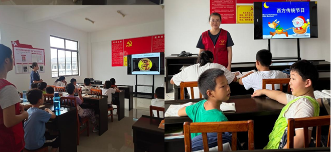 本期第一次课由公共课党支部党员教师张捷组织,本次小课堂以“西方传统节日知多少”为主题,通过生动有趣的讲解和互动活动,带领孩子们走进丰富多彩的文化世界。活动在兴旺村村部活动教室举行,现场气氛热烈而温馨。课堂上,张捷老师用浅显易懂的语言和丰富的图片、视频资料,为孩子们逐一介绍西方传统节日的起源、日期、庆祝方式及背后的文化意义,激发同学们学习英语的兴趣。