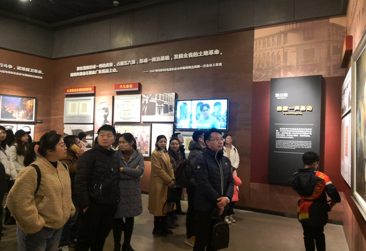 上午10点,在文家市镇秋收起义会师纪念馆前,全体党员怀着对革命先烈的无限敬仰,一齐鞠躬缅怀,并在校长助理刘志华同志的带领下,右手握拳,重温入党誓言。随后全体党员一同参观纪念馆。秋收起义文家市会师纪念馆基本陈列由会师旧址复原陈列和辅助陈列两大部分组成,会师旧址现存有:毛泽东及秋收起义其它领导同志的住房、前敌委员会会议旧址、战士住房、会师操坪、里仁学校等。湘赣边界秋收起义历史辅助陈列由暴动湘赣边、会师文家市、进军井冈山三个部分组成,四个展厅面积1100平方米,运用了声、光、电、雕塑、浮雕、多媒体等多种现代陈列手法,详细阐述了秋收起义爆发的历史背景,文家市会师对中国革命的深远影响,建立井冈山革命根据地的伟大历史意义。