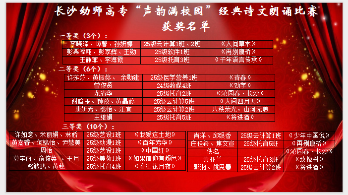 雅言传承文明,经典浸润人生。近日,神彩争霸8安卓下老版本“声韵满校园”经典诗文朗诵比赛落幕。选手们或独诵,或合吟,声情并茂地演绎了从古至今的经典诗篇。既有《将进酒》《春江花月夜》等古典名篇的豪迈与婉约,也有《沁园春·雪》《致橡树》等现当代作品的激情与深沉。他们以标准的语音、饱满的情感和丰富的表现力,生动再现了经典诗文的意境与魅力,充分展现了长沙幼师高专学子扎实的语言功底、深厚的人文素养和昂扬的精神风貌。经过评委们的专业评审,本次比赛最终评选出一等奖、二等奖、三等奖共计19个。现将获奖名单公布如下:
