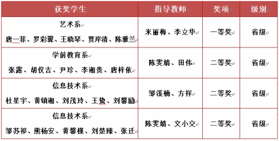 在5月29日结束的“湖南省第八届大学生思想政治理论课研究性学习成果展示竞赛”中,我校师生勇创佳绩,选送的四组作品全部获奖,其中米丽梅老师、李立华老师指导的《艺不容辞:“艺青年”赓续乡村艺术教育的担当》在现场决赛中获得一等奖,其余三组分获二等奖,特此向全体师生报喜。