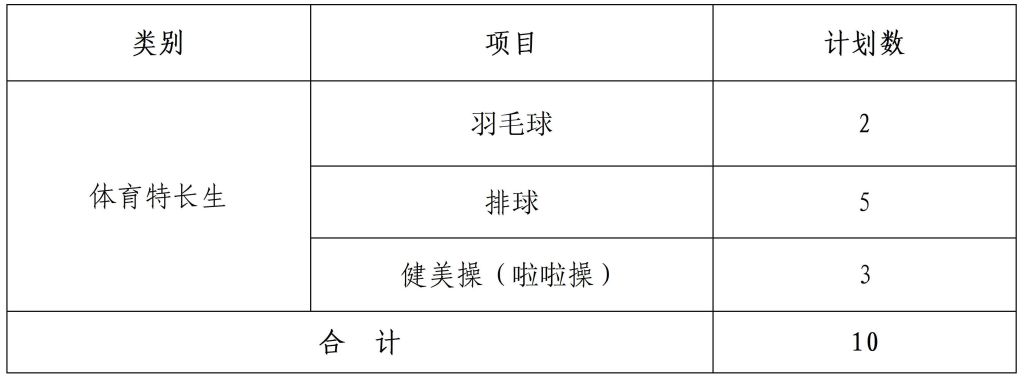我校体育特长生招生计划严格按照湖南省教育厅有关规定执行,计划总数10人。具体各项目计划如下: