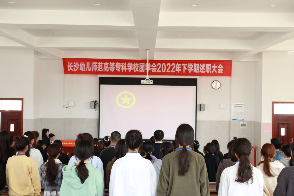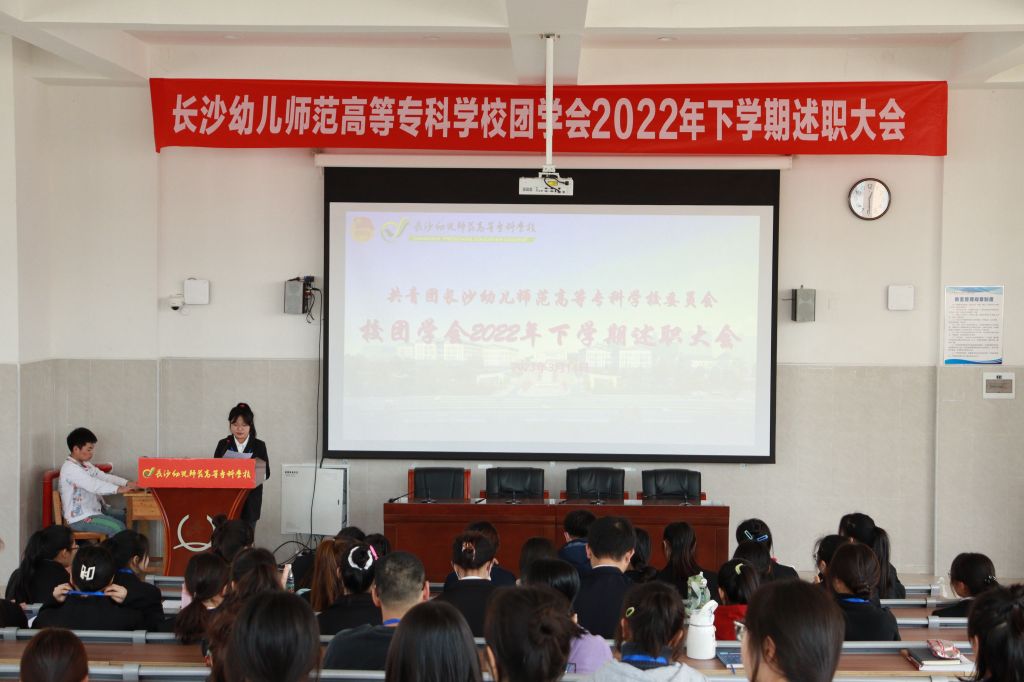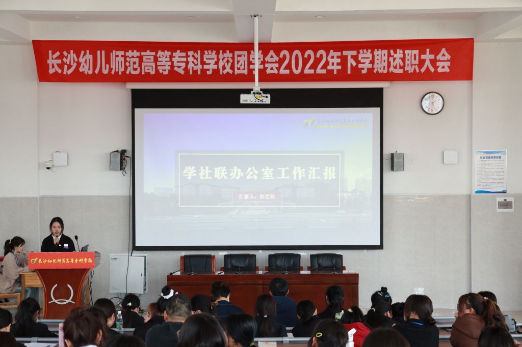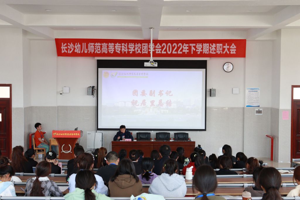会议在激昂的团歌声中拉开序幕。各部门负责人有序上台对2022年下学期工作进行述职汇报,汇报人围绕工作成绩,突出亮点,反思不足,未来展望等方面逐一阐述。