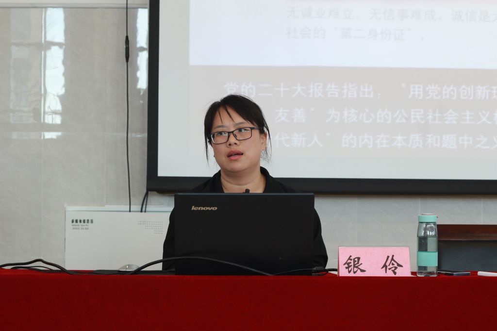 本次团课主题为《怀青春鸿鹄梦想,做品德高尚学子》。银伶老师结合党的二十大报告解说以及社会主义核心价值观解读,围绕三个方面展开讲座:一是“坚定学生的信仰、信念、信心”,二是“引导学生树立正确的世界观、人生观、价值观”,三是“激励自觉回答中国之问、世界之问、人民之问、时代之问”。团校积极分子们全神贯注,与老师互动频频。