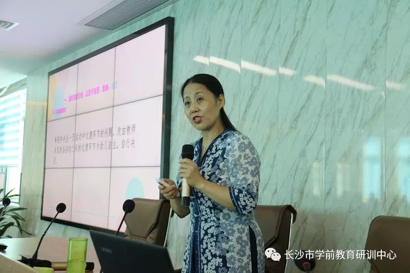 在学习《指南》后的思考这一模块中,陈园长通过对比分析国外两所不同教育模式的幼儿园,给了在场所有老师很大的启发:环境创设不同、教育过程不同将导致幼儿在园生活获得的学习经验不同,追溯造成这两者不同的背后根本原因就是教育理念的不同。陈园长分享了虞永平教授的《幼儿园课程建设三个走向》,深刻的提出幼儿园老师应该引导幼儿去做适宜的事、感兴趣的事,而教师在这个过程中应学会观察幼儿,学会分析幼儿作品,学会设计、组织和评价课程。陈园长还从创新健康管理和做实科学教育两个方面,分享了长沙市政府机关第三幼儿园践行《指南》的系列做法,她结合了大量的视频以及图片娓娓道来,让参培学员感受到幼儿园原来可以办得这么有情怀、有品质,更加坚定了去小学化的决心和做法。