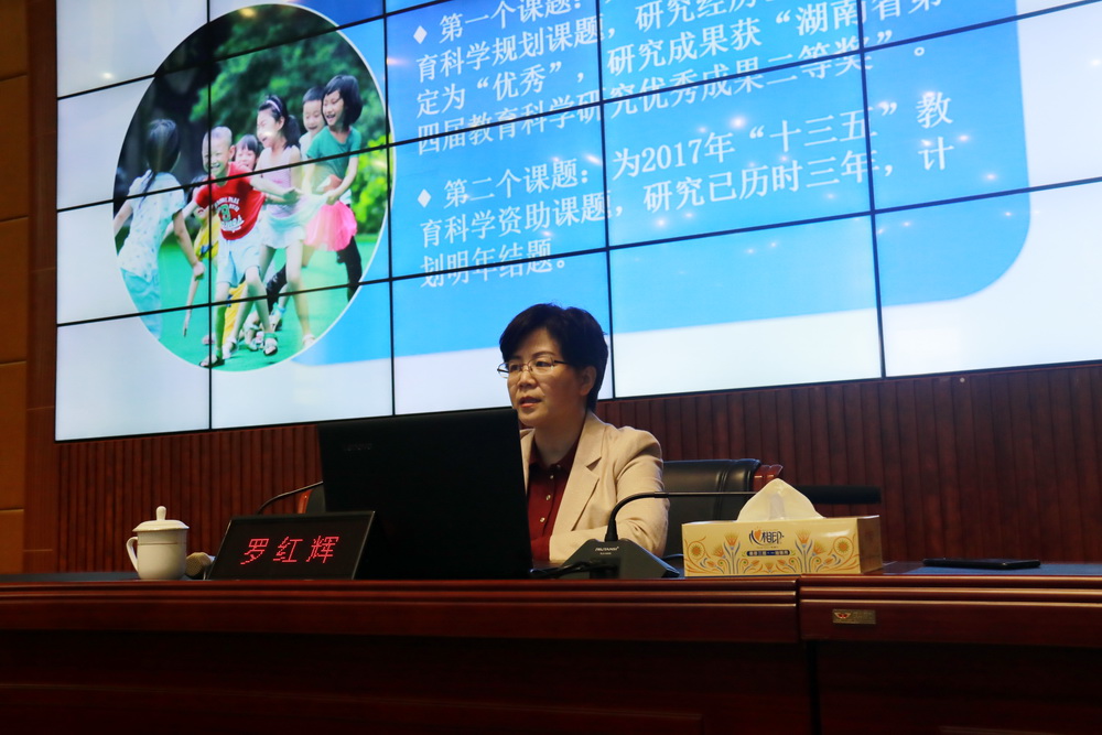 简短的开班典礼过后,湖南省人民政府直属机关第一幼儿院院长罗红辉为我们带来了《民间游戏在幼儿园的创新应用》的专题讲座。首先,罗红辉对民间游戏的意义、民间游戏的特点与价值、民间游戏的收集整理方法进行了详细地分享与介绍,让我们系统的了解了民间游戏的价值、类型及分类方法。接着,罗红辉根据自身达10年的研究对民间游戏的创新应用方法提出了 “融合式、契合式、适合式、转合式”的 “四合式”运用模式,为老师们在幼儿园开展民间游戏提供了新的思路。最后,罗红辉分享了在开展民间游戏的过程中教师的支持与指导策略,为老师们组织民间游戏活动指明了方向。