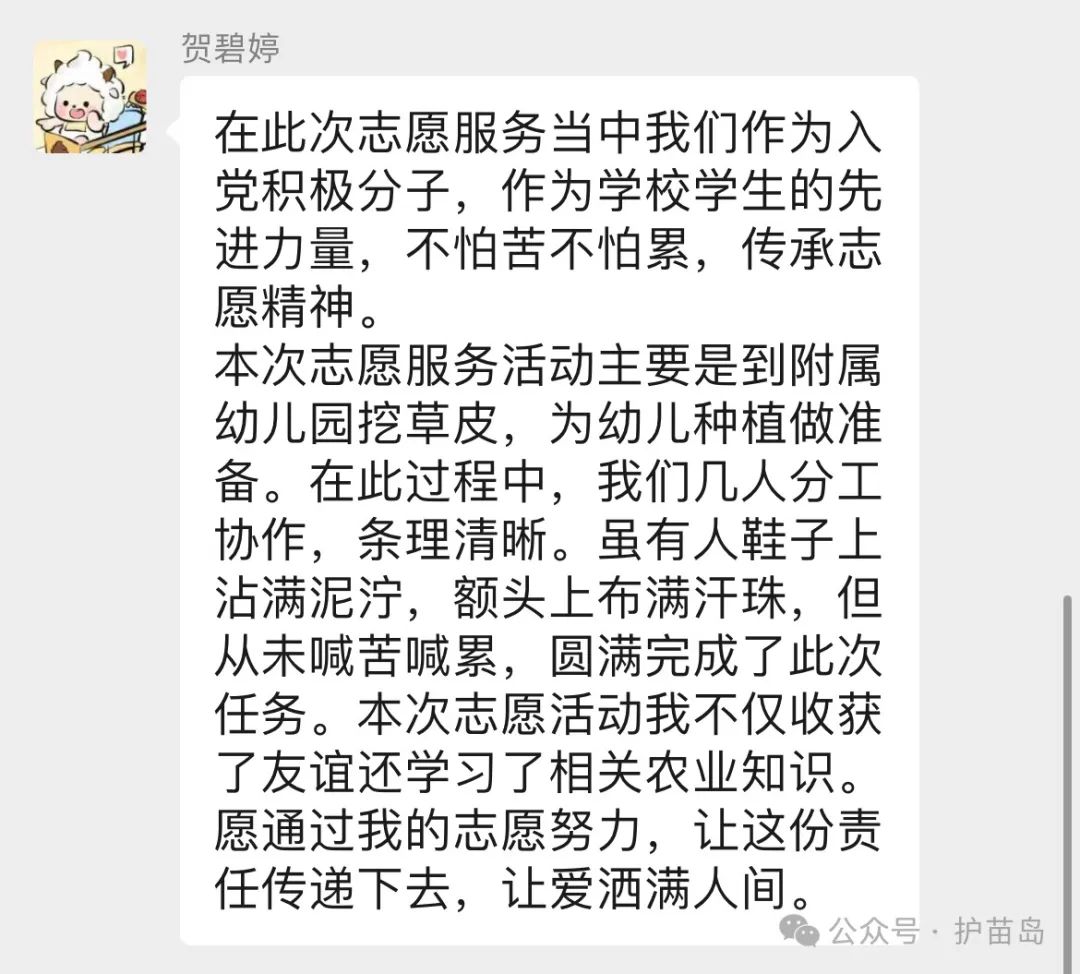 此次“园校结对”志愿服务活动不仅加强了学前教育学院与附属幼儿园的联系,党员教师和学生入党积极分子们用实际行动诠释了党员的先锋模范作用,通过参与实践,坚定了服务社会、奉献社会的信念,同时也为幼儿园的孩子们努力创造接触自然、学习种植的环境。“护苗”朝阳志愿服务活动将会持续开展,赓续雷锋精神,为构建和谐校园贡献力量。