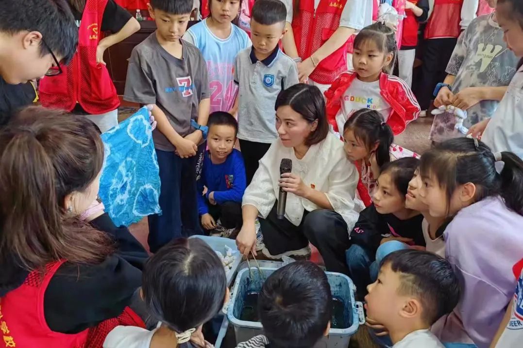 为了让孩子们更好地了解和体验传统文化,戴蔚蓉带领大家体验了扎染艺术。她首先向孩子们介绍了扎染的丰富历史和独特的制作技艺,接着和志愿者一起带着孩子们实践,制作扎染作品。一块方巾,扎一份童真,染一份传承,孩子们零距离接触扎染,掌握扎染的基本手法,在自然中寻找“形”与“色”。