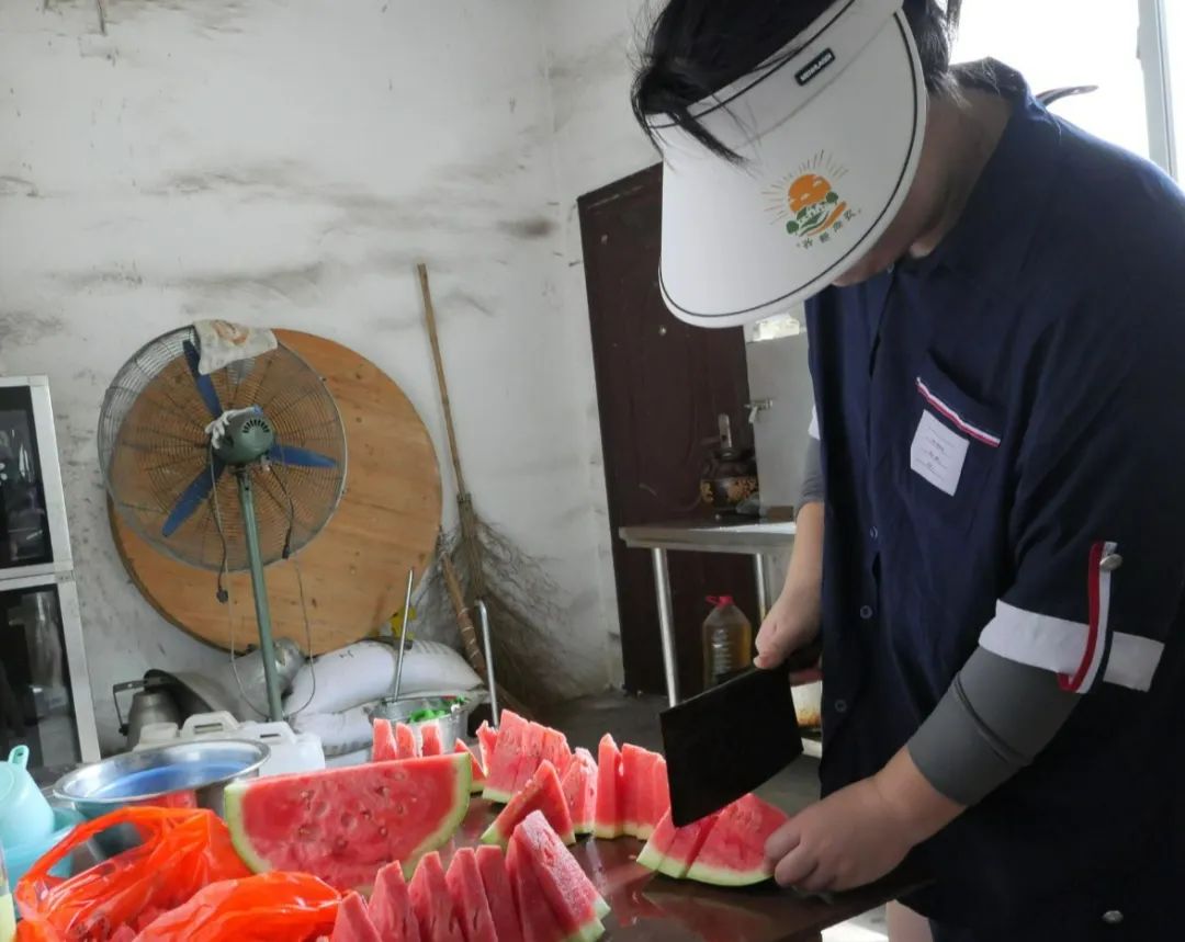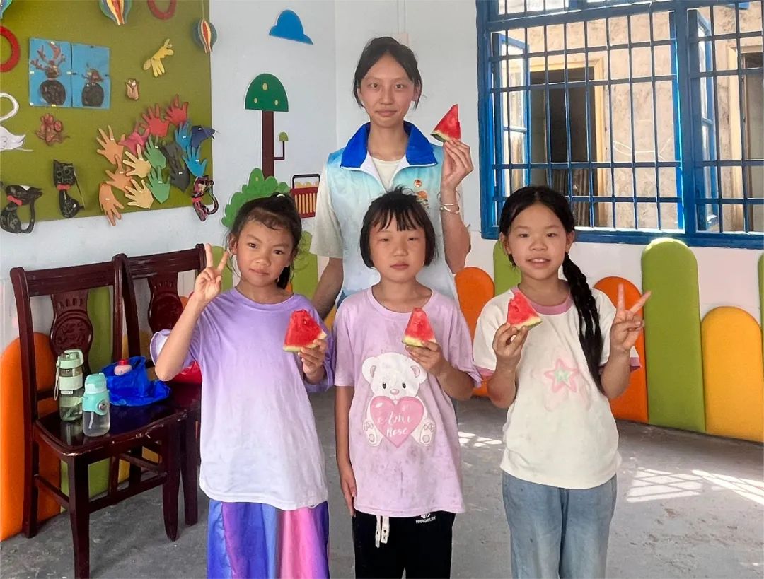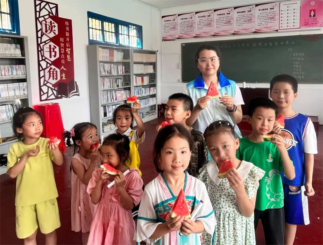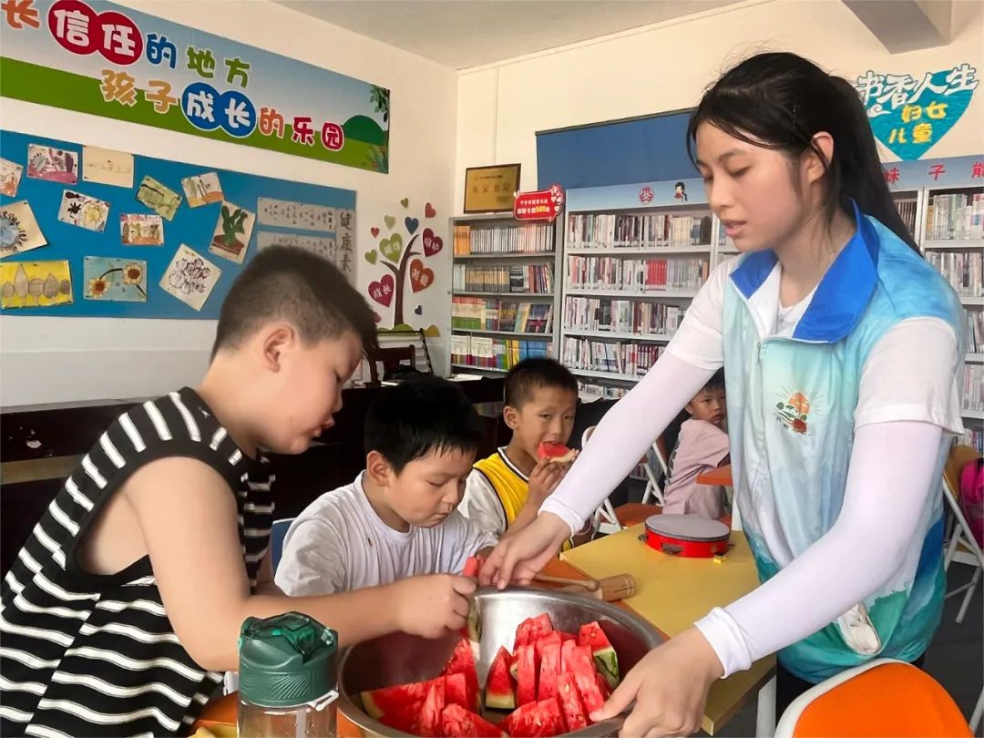讲座尾声,志愿服务队的指导老师们贴心地端出了清甜可口的西瓜,并让志愿者逐一送到每位孩子手中。这清凉的一刻,不仅为孩子们驱散了夏日的炎热,更在他们心中种下了关爱与温情的种子。