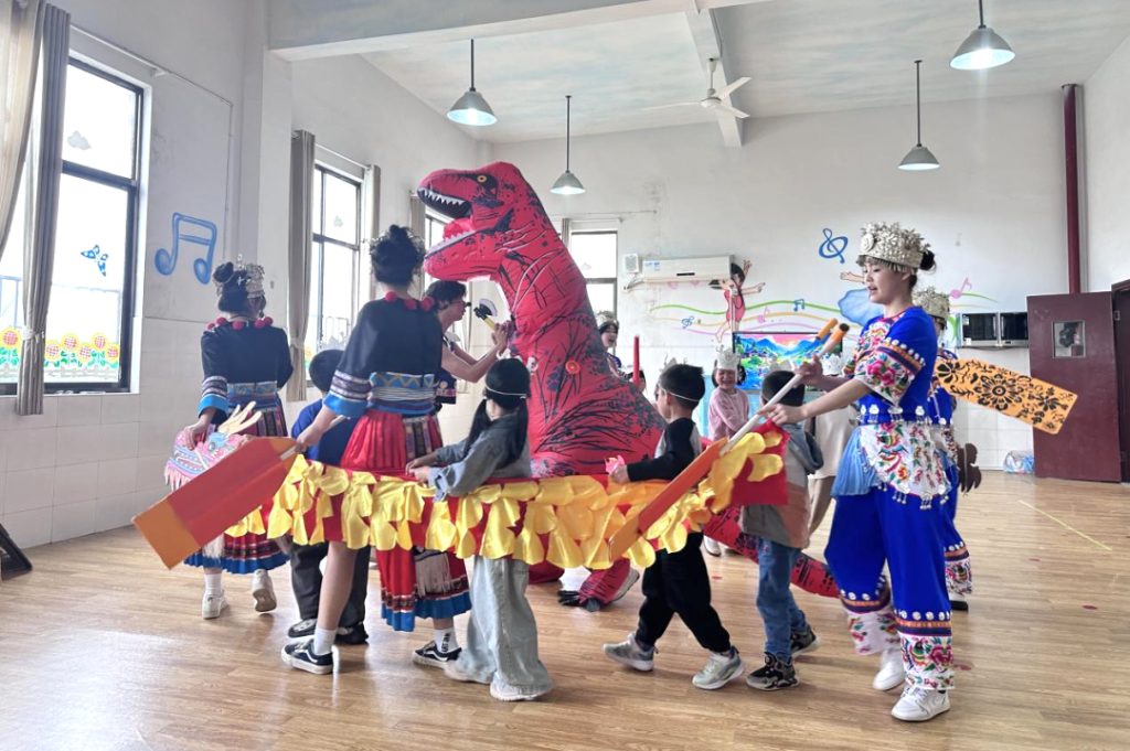 党员教师邓玉湘携舟行苗疆大学生创新创业团队走进同兴幼儿园🙍🏻♂️,以原创非遗文化绘本《滕小禾智斗恶龙》开启一场奇幻的文化之旅。志愿服务队化身“非遗故事魔法师”🤦,通过立体书页、声效互动和苗绣纹样插画,带领孩子们沉浸式体验苗族英雄传说。