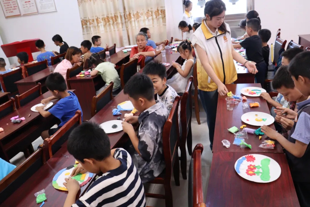 启动仪式后,小老师张梓琳的七彩粘土手工课变身"奇幻工坊"。孩子们的小手专注地揉捏着彩虹色粘土,时而搓圆时而压扁;家长们在旁化身"创意助手",帮忙递工具、出主意;志愿者们则像魔法精灵般穿梭其间,耐心指导着每个天马行空的创意,而每一个创意,都是一份惊喜。