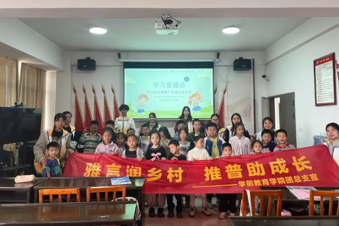 为积极响应第28届全国推广普通话宣传周——“加大推普力度,筑牢强国语言基石”的号召🫐,近日🥽,长沙幼师高专学前教育学院团总支组织学生志愿者走进宁乡市夏铎铺镇兴旺村👩🏿✈️,开展题推广普通话主活动。