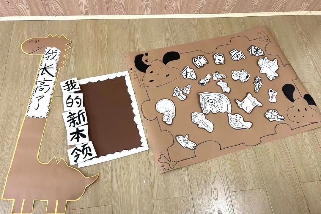 创意环创环节。志愿者们围绕“成长”主题各显神通,将教室装扮成生动的互动空间。长颈鹿尺上的“我长高了”趣味盎然,“我的新本领”展示区等待孩子们书写进步,“我的自画像”板块则充满了天真的童趣。每一处设计都兼具美感与教育意义。