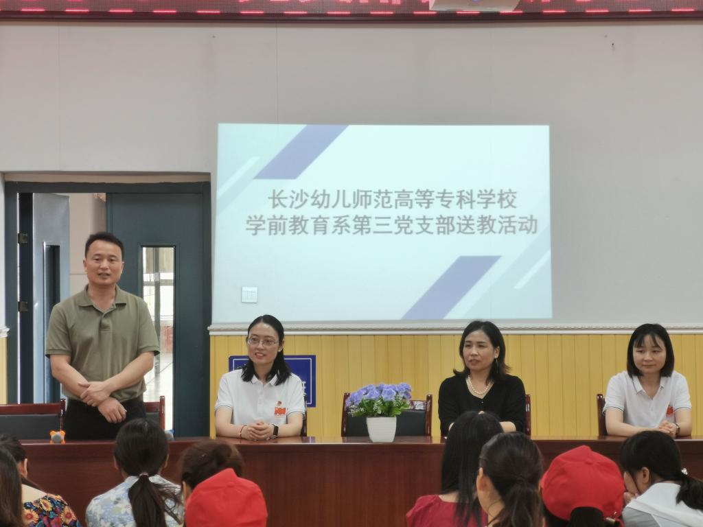 为更好的响应三胎政策,承担大学社会职责,带动地方乡村教育发展,发挥学校学前专业优势,将党史教育落实到实处,7月2日,我校学前教育系第三党支部5位党员教师、10位学生,来到宁乡黄材镇基地校,开展“学史力行 送教下乡”公益活动,多形式多渠道助推黄材镇学前教育发展,黄材镇区域内近20名幼儿教师参与了此次活动。