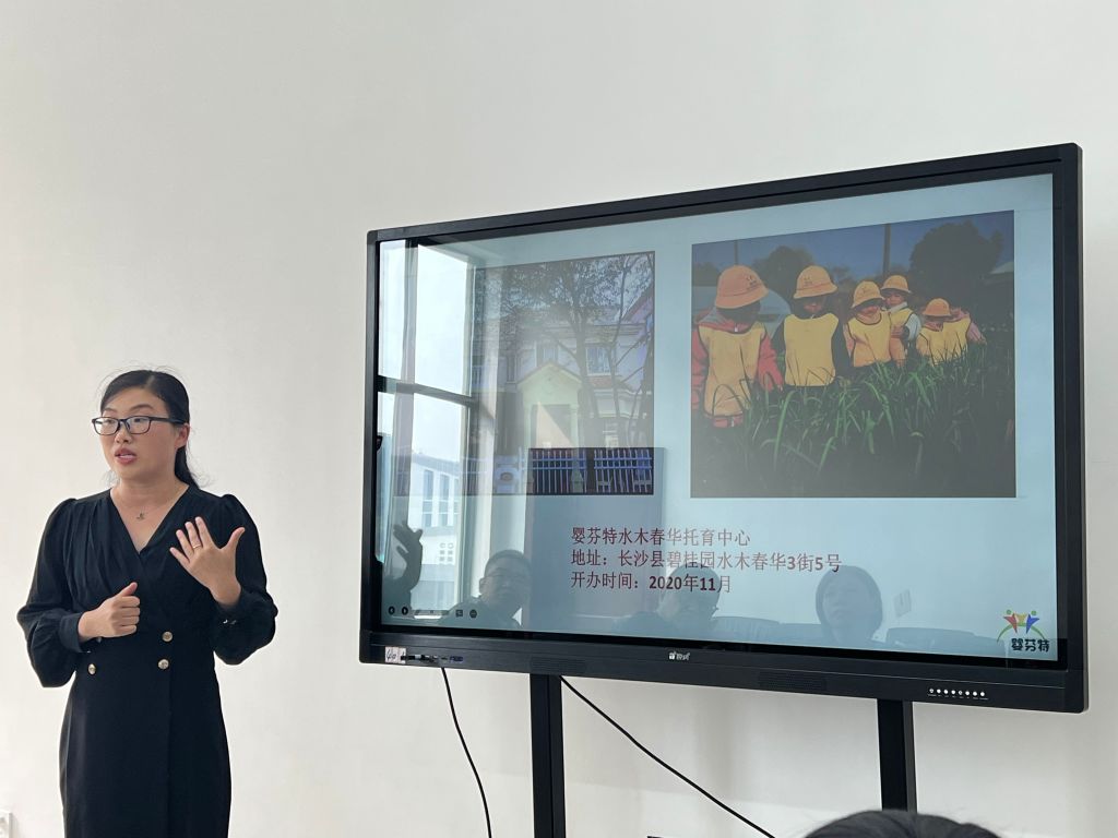 首先,阳艳波简单介绍了双方与会人员,并从学院专业设置、学生情况、专业发展三方面向园方介绍了学院基本情况。接着,梁卉从学生人数、师资队伍、实践教学几方面介绍了婴幼儿托育服务与管理专业。刘满莹介绍了早期教育专业人才培养方案和合作需求。接下来,吴丽简单介绍了婴芬特托育中心旗下7家托育机构的基本情况,并分享了婴芬特托育中心的特色课程,展现了托育中心“守护祖国花朵,给孩子看得见的未来”的教育情怀。