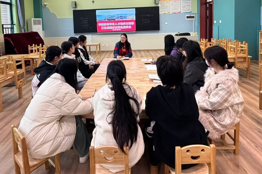 近日,学前教育学院早期教育专业召开2025年人才培养方案修订及课程诊改师生座谈会。专业教师团队核心成员,21级五年制与23级、24级大专班共15名学生代表参与会议。