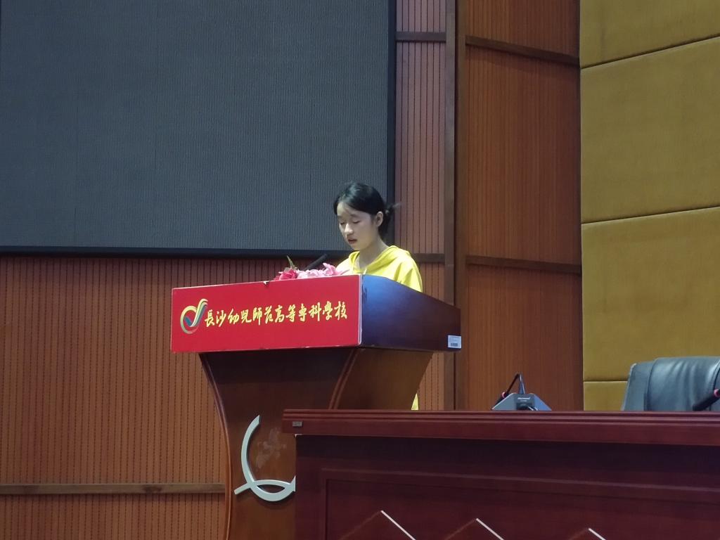 接着,罗萌作为教师代表发言。她用“新体验,新变化,新起点”三个“新”描述了学生在见习中的成长,同时从专业的角度,给学生后期的学习提出了中肯的建议。 学前一班郑丹丹同学表示衷心感谢学校精心安排本次见习活动,让她和同学们有机会体验虽辛苦但很充实的幼儿园生活,让她们有机会与幼教界的名师学习,也让她们对未来的学习有了更清晰的奋斗目标。