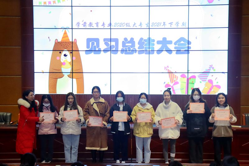 会议第四项,由黎晓林宣布优秀见习生名单,阳艳波为胡艺晖等37名同学颁布荣誉证书、合影留念并总结讲话。她希望大家懂感恩、知敬畏、有责任,做新时代合格幼儿园教师。