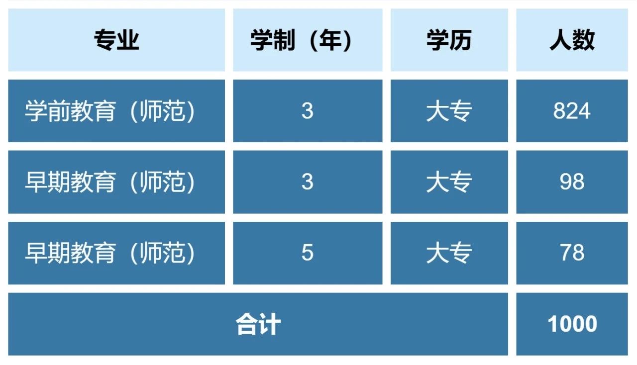 学前教育学院2025届学前教育、早期教育大专毕业生共计1000名,岗位实习日期为2024年秋季学期,具体到岗日期需与幼儿园约定,以幼儿园开学、放假时间为准。
