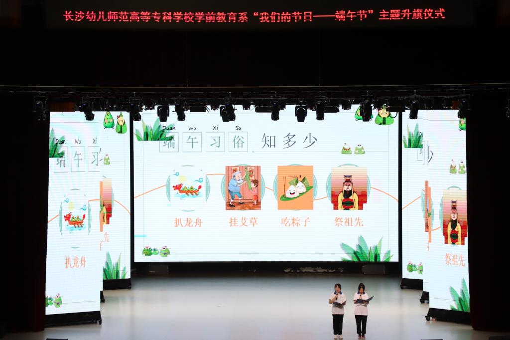 为弘扬中华民族传统文化,提升学生的爱国情怀,6月15日上午,学前教育系在汇美馆举行了“我们的节日——端午节 ”为主题的升旗仪式,本次升旗仪式由早教二班主讲。