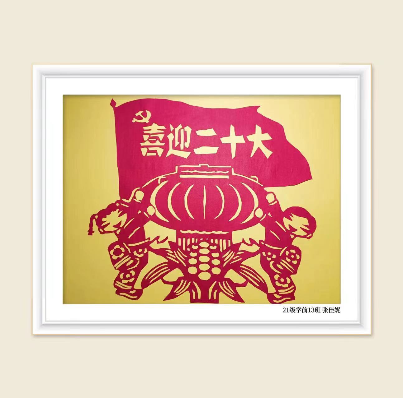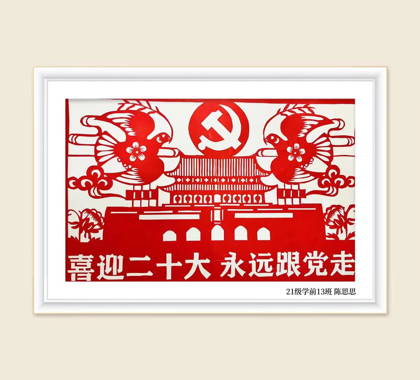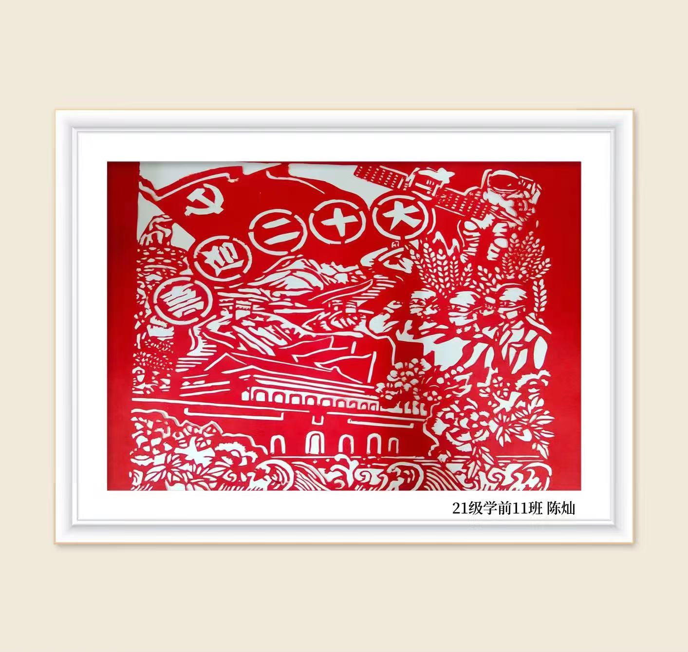 21级学前教育专业的学生们,伏案围坐,铺展红纸,直刀斜刻——在一堂堂常规而生动的美育思政课上,陈郁、戴蔚蓉老师带领21级学前教育专业的学生们,通过剪纸创作献礼党的二十大胜利召开。
