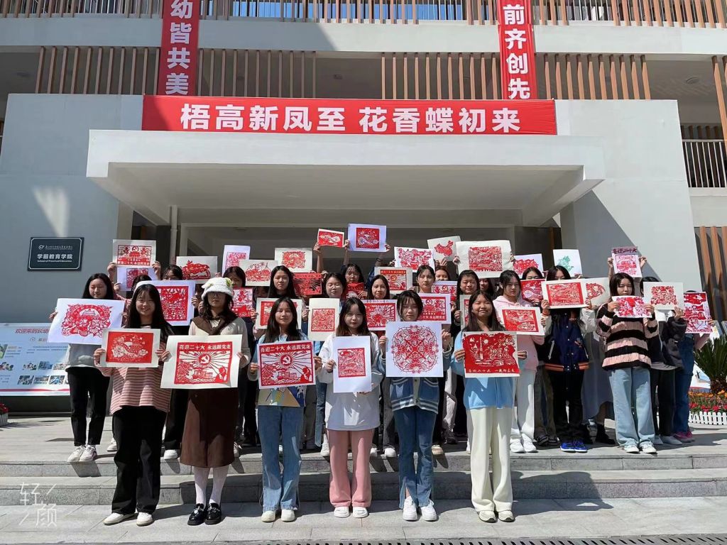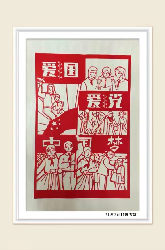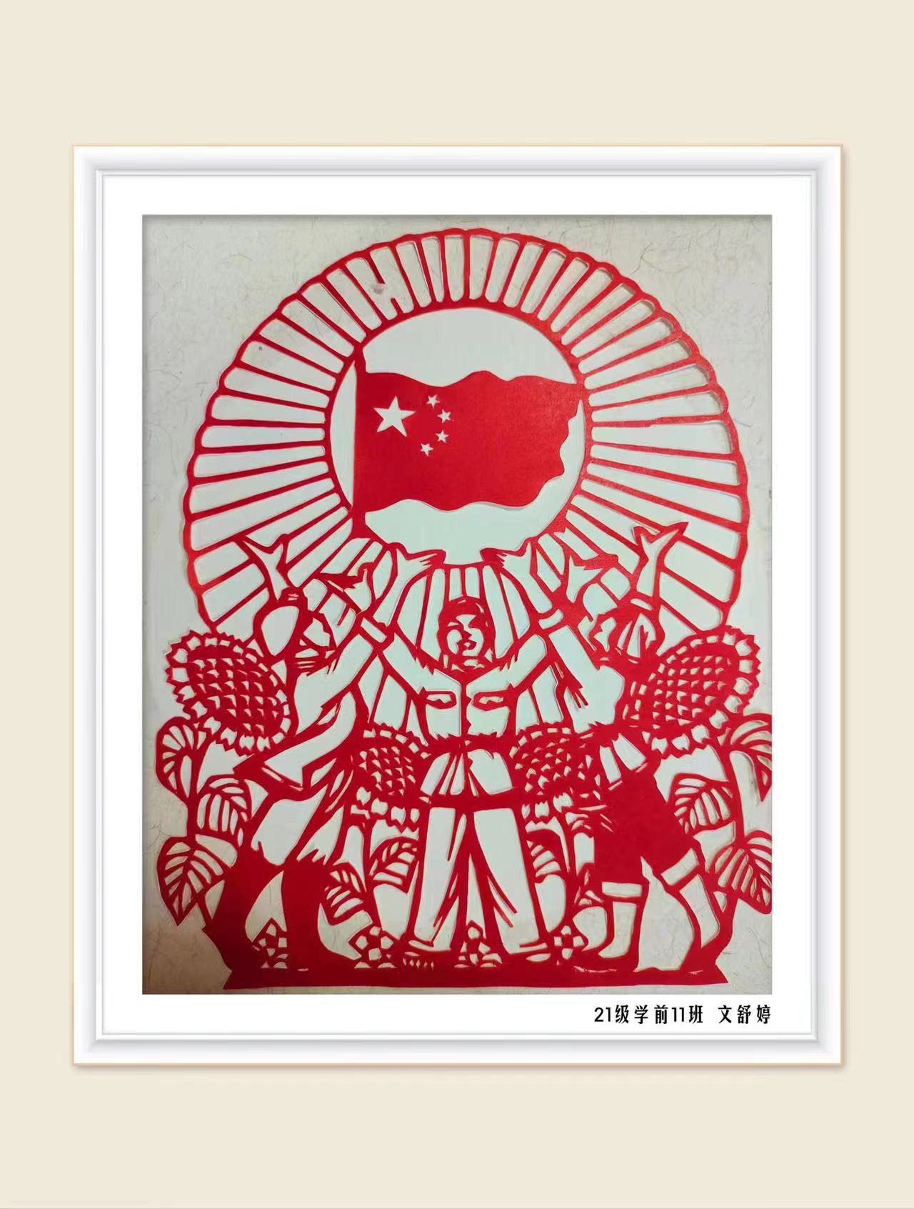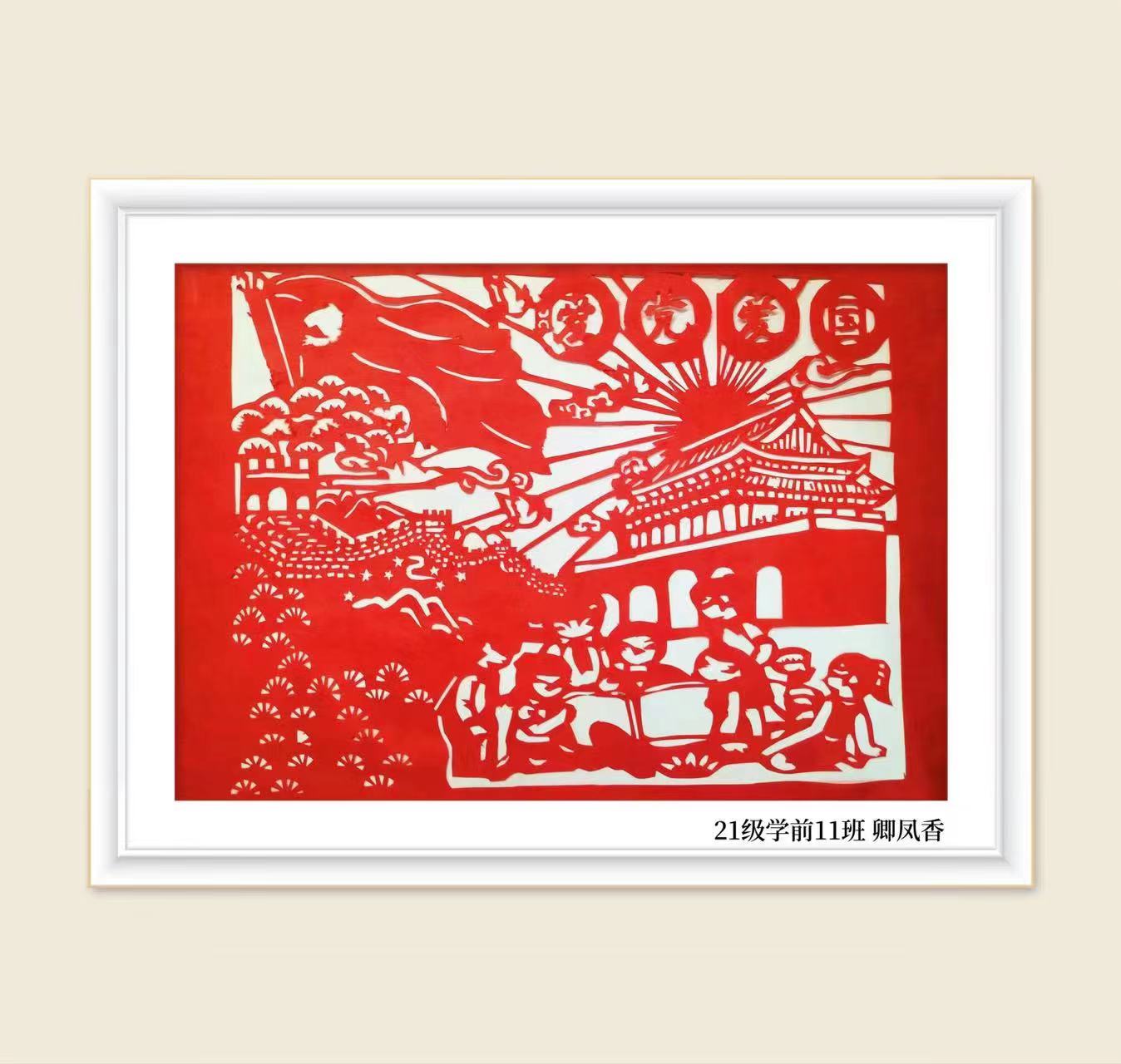21级学前教育专业的学生们,伏案围坐,铺展红纸,直刀斜刻——在一堂堂常规而生动的美育思政课上,陈郁、戴蔚蓉老师带领21级学前教育专业的学生们,通过剪纸创作献礼党的二十大胜利召开。