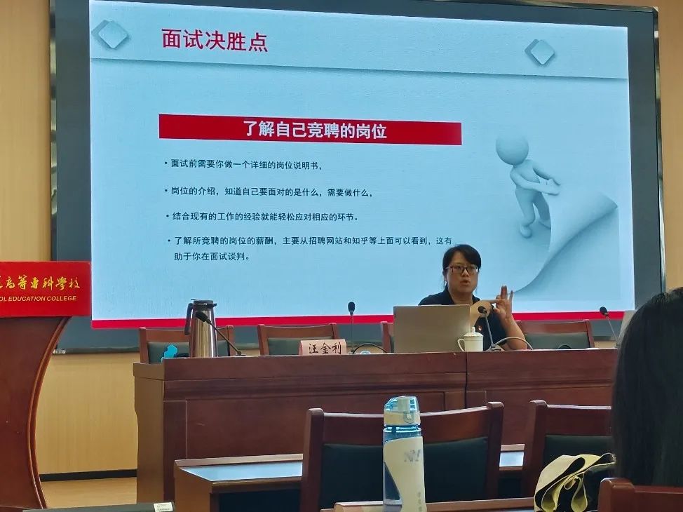 学前教育学院教师银伶最后给同学们带了一场简历制作和面试技巧的小课堂,她告诉我们“简历应该怎么写”“面试准备工作有哪些““面试的决胜点”,通过以上几个方面深度分析了面试通过的小技巧,实用且生动。