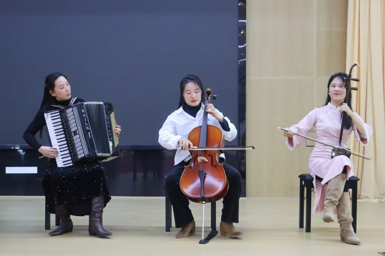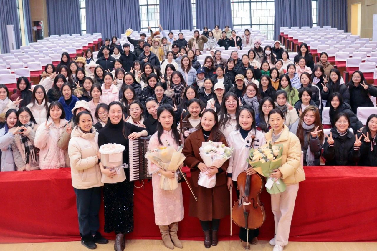 除了引人入胜的理论讲解,本次讲座还特邀易婷、朱佳和李红娟老师,与几位乐器专长的同学一同,现场展示不同乐器的魅力,让大家近距离感受音乐氛围。一曲过后,三位老师意犹未尽,还携手即兴返场表演了一段《铃儿响叮当》,将气氛推至高潮。