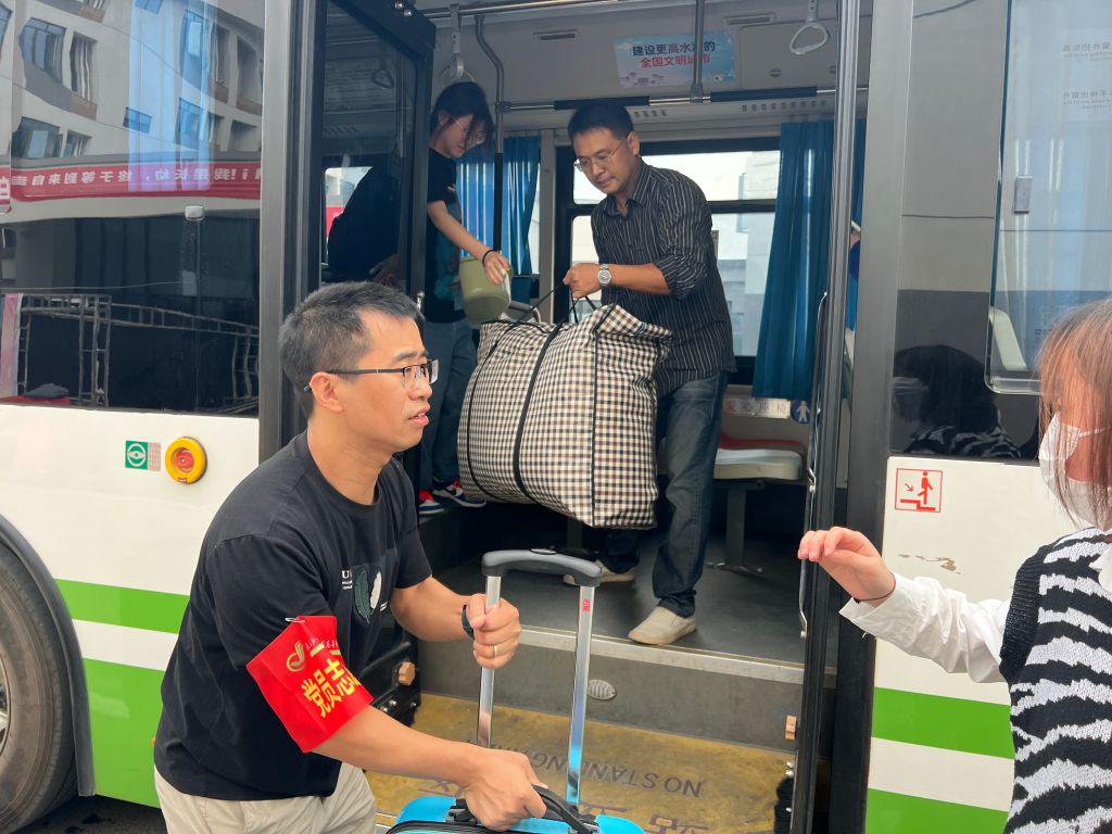 上午9点,学生宿舍楼下已经可以看到学前教育学院党员志愿教师们忙碌的身影。每来一辆载满学生的大巴,雷小云、杨林、张柱几位老师便冲上前去,指挥学生有序下车,“孩子们,零散行李你们自己带下去,大件重件不用管,我们来搬!”雷小云老师第一个冲上车,随后三位老师以“接龙”的形式,你传我接,卸下整车行李。随后,刘满莹、张玲、李剑波、杨祖爽、杨少武、李丹几位老师也忙开了,他们左手提着一大袋,右手推着一大箱,肩上还扛着一大包,一趟又一趟,奔向各栋宿舍......他们是老师,但是此时,他们更像送孩子到校的父亲、哥哥、姐姐。