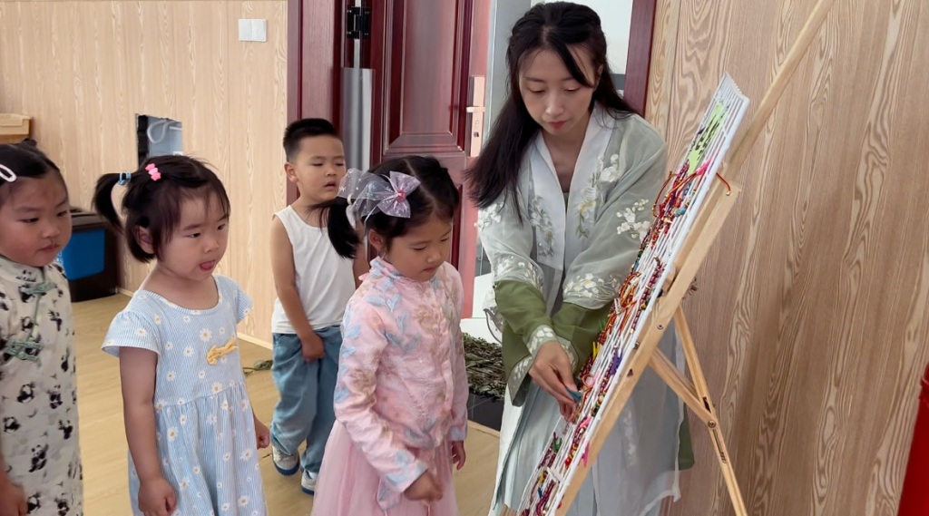 老师为孩子们准备了五色绳,五彩绳代表着祈福安康的美好寓意!