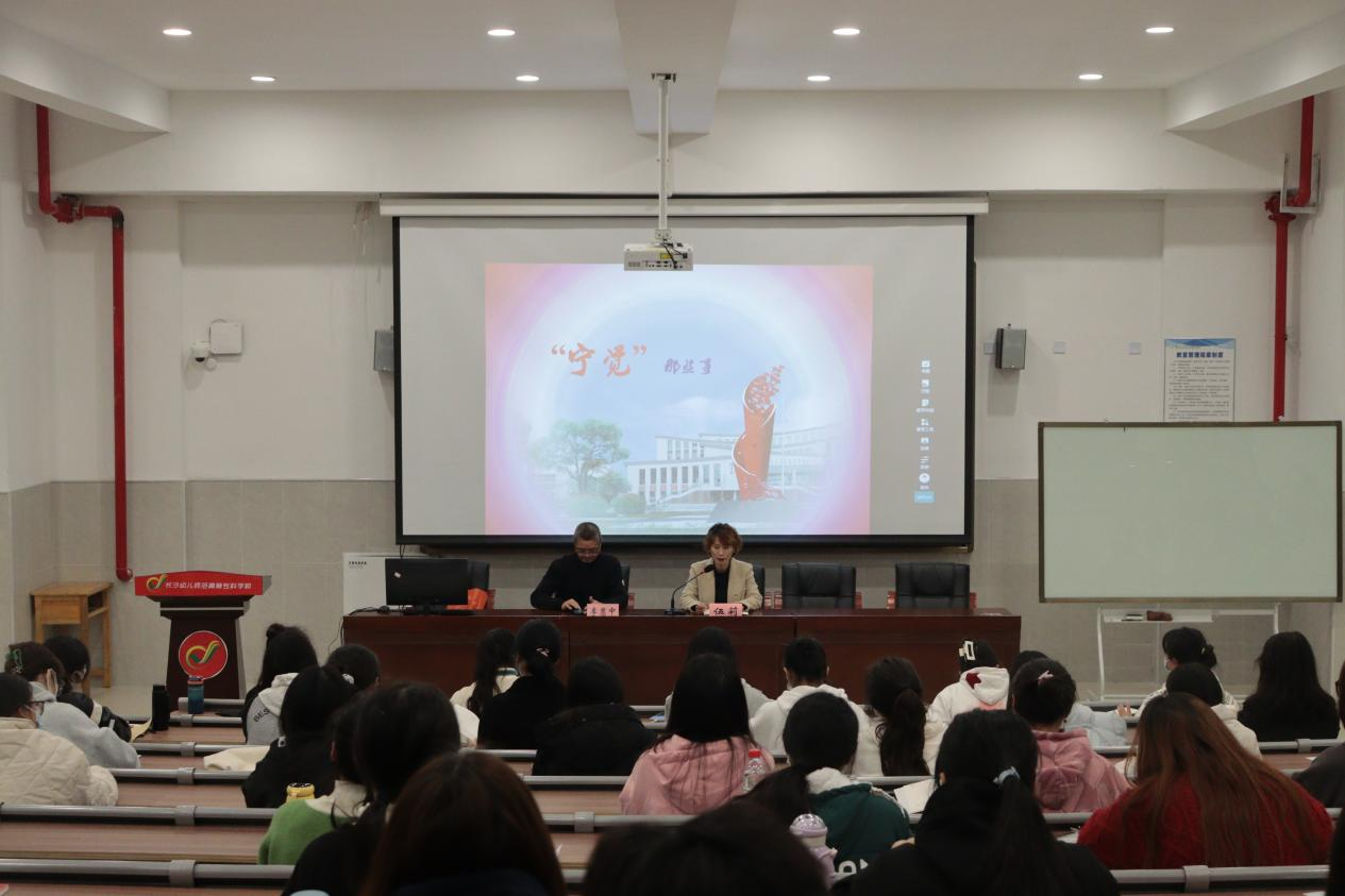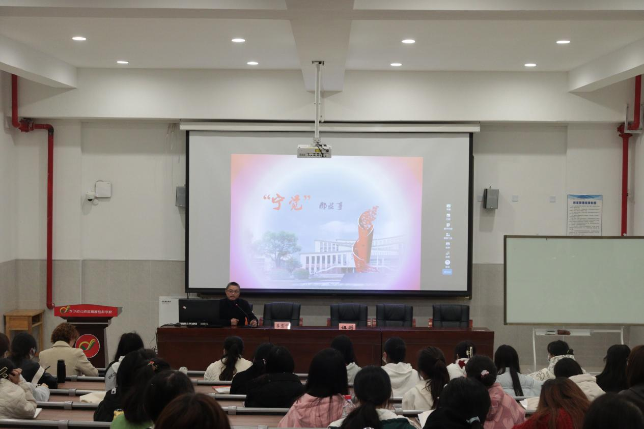 1925年2月,在当时被称为“甲师”(宁乡县甲种师范讲习所)的我校举行了宁乡县第一批党员入党宣誓大会和第一个党支部的成立大会,党支部代号为“宁觉”,意为宁乡觉醒。李慧中以“宁觉那些事”为主题,分别从四个部分向学生们讲述了“宁觉”精神的由来与内涵、“宁觉”精神诞生于我校的原因与发展历程、“宁觉”精神领导下的斗争故事以及传承“宁觉”精神的要求与期盼。李慧中自豪地讲到,一百多年来,虽然学校多次易址办学,几更校名,多番周折,但“爱国求知、教育报国”的初心始终映照每一代长幼人,他们秉承着学校的光荣传统,用实事求是的作风、敢为人先的精神,把立德树人放在首位,为党和国家培养出一批批德智体美劳全面发展的建设者和接班人。“宁觉”已成为长沙幼专的精神图腾。