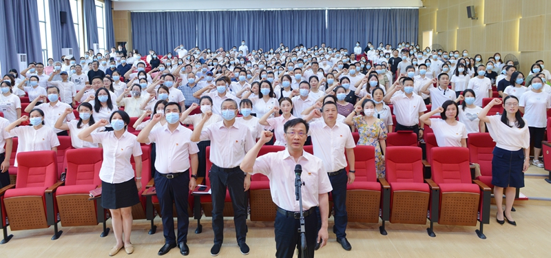 在雄壮的国歌声中,大会拉开帷幕。15名新党员代表和全体老党员在党委书记肖思源的带领下面对鲜红的党旗,握紧右拳,庄严宣誓。一句句铿锵有力的誓言表达了共产党员不忘初心、牢记使命,为中国共产党奋斗终生的夙愿。