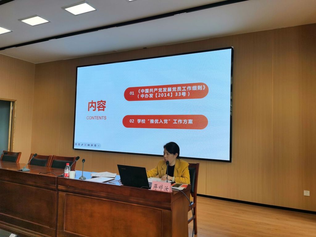 培训会上,蒋婷汝以《聚焦发展党员细节,夯实党务工作根基》为题,结合多年党务工作经验,对《中国共产党发展党员工作细则》进行了全面系统的解读。她重点围绕发展党员工作的5个阶段25个步骤展开讲解,详细阐述了申请入党、入党积极分子的确定和培养教育、发展对象的确定和考察、预备党员的接收、预备党员的教育考察和转正等关键环节的具体要求和操作规范。在讲解入党积极分子培养考察环节时,蒋婷汝特别强调要建立“一对一”培养联系人制度,定期开展谈心谈话,确保培养教育工作落到实处;在发展对象确定环节,她详细说明了政治审查的具体内容和方式方法,要求必须做到“凡进必审、凡审必严”;在预备党员接收环节,她重点讲解了支部大会讨论表决的程序要求和注意事项。同时,蒋婷汝还结合学校最新修订的《推优入党工作方案》,对"推优"工作的标准条件、推荐程序、培养教育等方面进行了深入解读,强调要坚持政治标准,严格工作程序,确保发展党员质量。