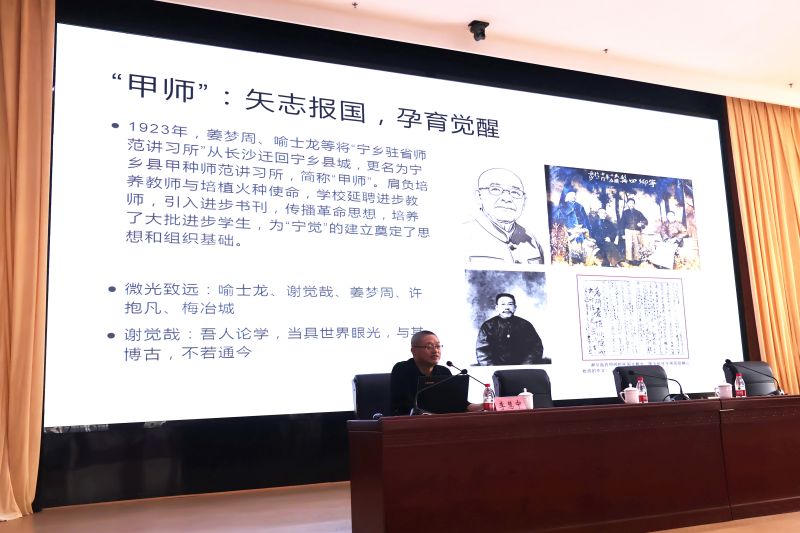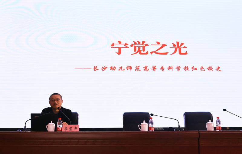 典礼结束后,李慧中以“赓续宁觉 强国有我”为主题,为培训班讲授了第一堂党课。他围绕学校120年历史脉络,生动讲述了学校不同历史阶段的发展历程。他以学校标志性建筑宁觉广场的火炬为切入点,重点介绍了“宁觉之光”火炬的设计意图和象征意义,带领学员们进一步了解了学校的红色历史。从周震麟先生的“创造有利于国家和民族的事业”的办学初衷,到“甲师”师生矢志报国、舍生取义的时代觉醒,从扎实办好中等师范教育,到顺应时代变化培养阳光自信职业人,学员们深刻感悟到学校百余年来矢志教育报国、紧跟中国共产党的脚步干事创业、奋楫笃行的初心和决心,也从一代代长幼人身上领悟到责任与担当。李慧中勉励全体入党积极分子,要领悟好学校红色文化的精神内涵,传承好红色基因,让长幼的精神图腾“宁觉之光”在新时代绽放更耀眼光芒。