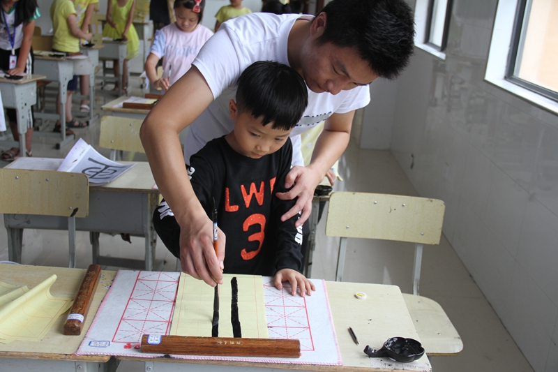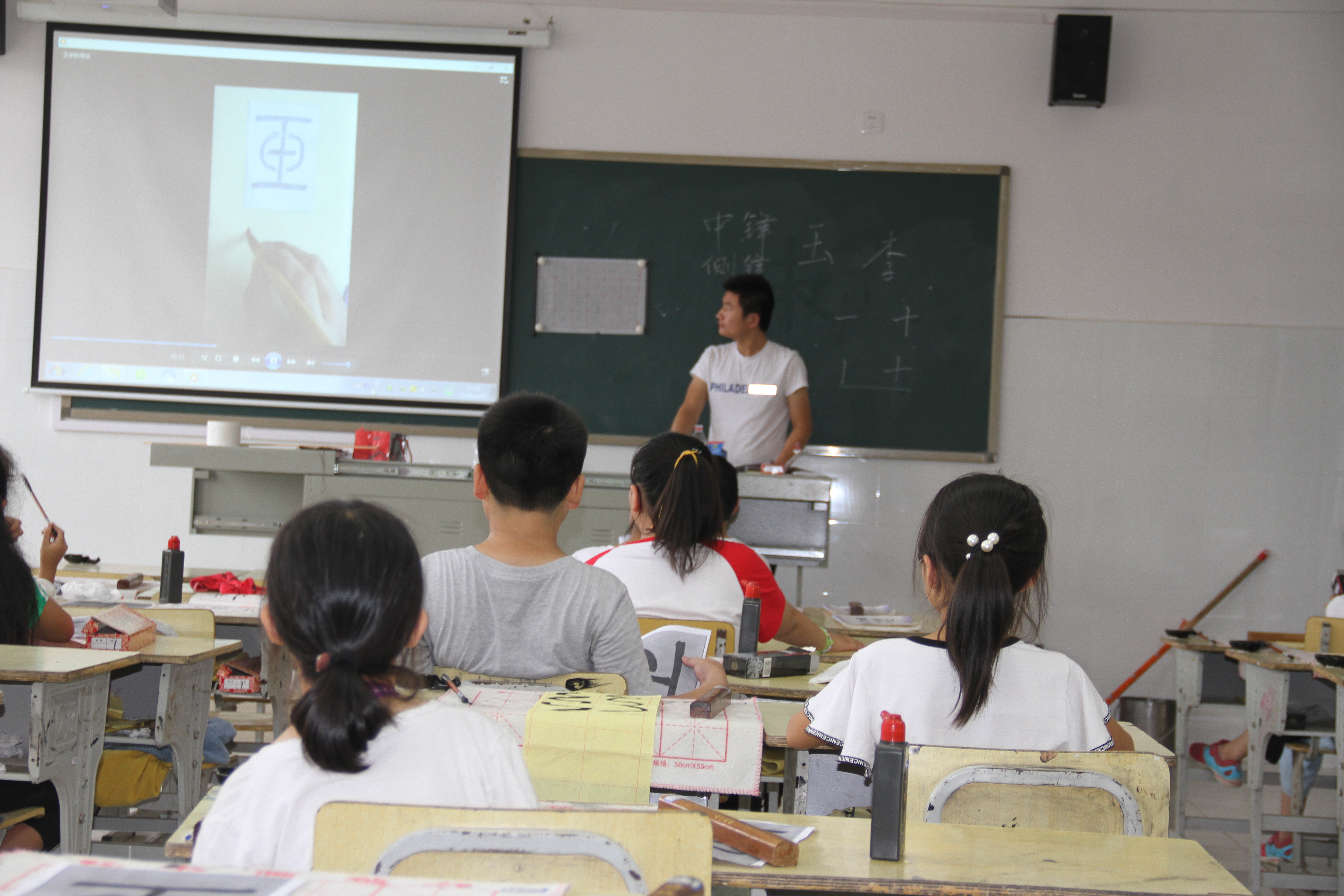 李剑波老师执教的《书法临摹与楷书技法》,以先进的教学理念、巧妙的教学设计、灵活的教学方法、精彩的点拨引导,使学生积极参与课堂并融入教学。考虑到当地的教具及学生的基础不足,出发前他特意为每个学生打印了教学资料,在教学过程中手把手对孩子进行指导;精心制作了教学小视频,便于孩子们在课后学习。