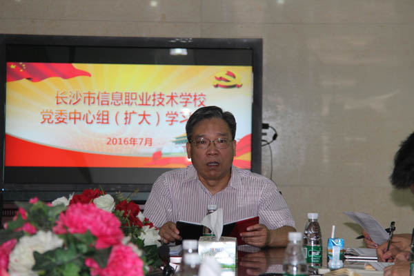 7月24日上午,长沙市信息职业技术学校召开党委中心组(扩大)学习会议,校党委书记张国斌传达了市教育局关于学习习近平总书记“七一”讲话的重要会议精神。校长郭正良、校纪委书记李深山、学校中层干部和各支部书记等出席会议。