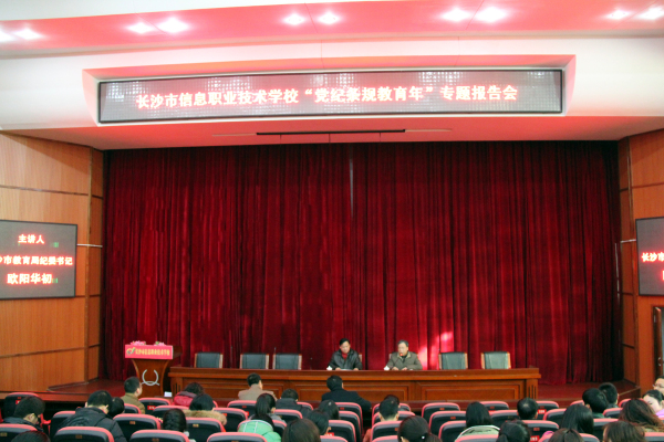 为落实市纪委“党纪条规教育年”活动要求,切实加强党员干部队伍建设,推进学校各项事业发展,我校于12月30日在学校汇智厅举行专题报告会,组织全体党员教师学习党纪条规。并邀请长沙市教育局纪委书记欧阳华初同志为全体党员作专题讲座,学校党委书记张国斌主持会议。