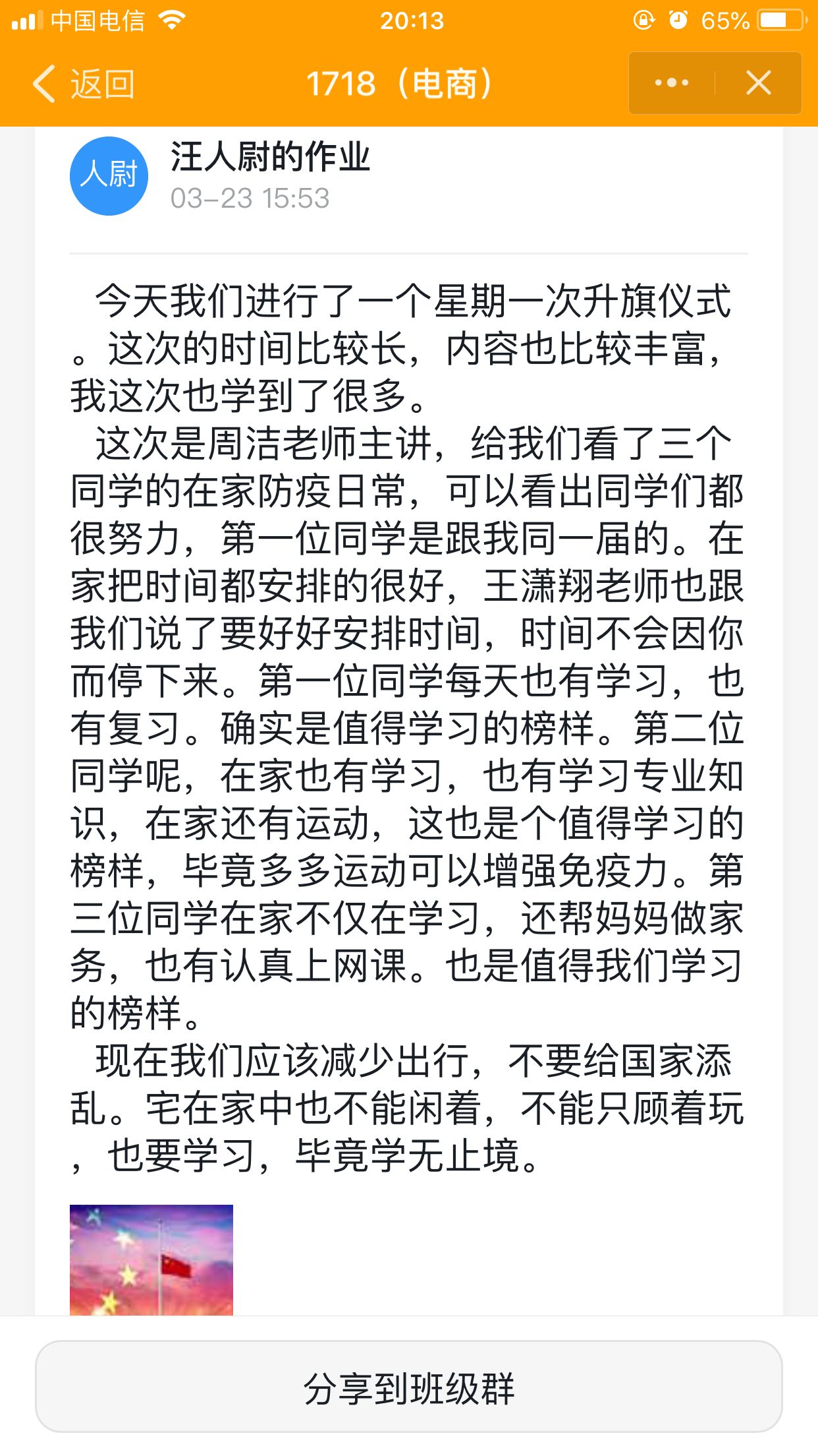1918余荣添::观看了本周的升旗仪式,我有所感触。老师和我们分享了一些同学在家的学习情况和生活习惯并且做了自己力所能及的事情,这一点真的让我自愧不如。以后我将会向这些优秀的同学看齐,并制定好居家隔离的计划并一直坚持下去。1.按照学校的作息时间,按时作息。2.每天学习时间达到3小时。3.每天帮父母做一件力所能及的事情。